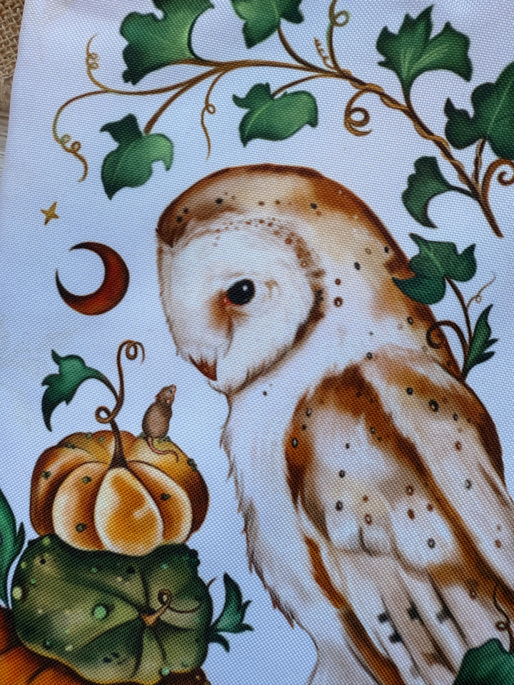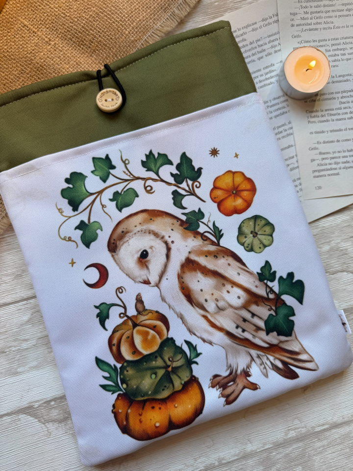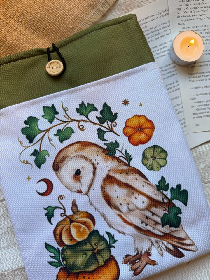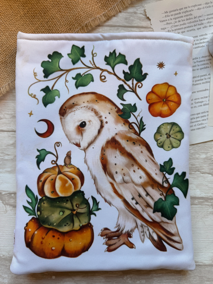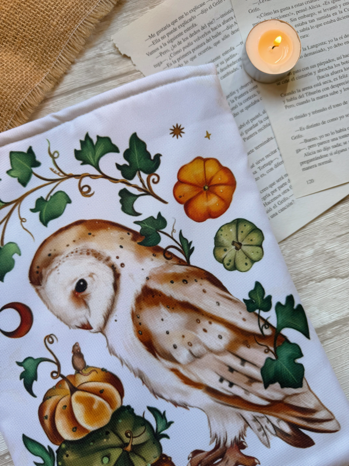 Funda de libro L ” Lechuza conversando entre calabazas”